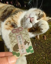 同じ神社猫として神さまと参拝者に愛されるミケちゃん。三毛猫は魔を祓い、無病息災に幸福を招くといわれます。